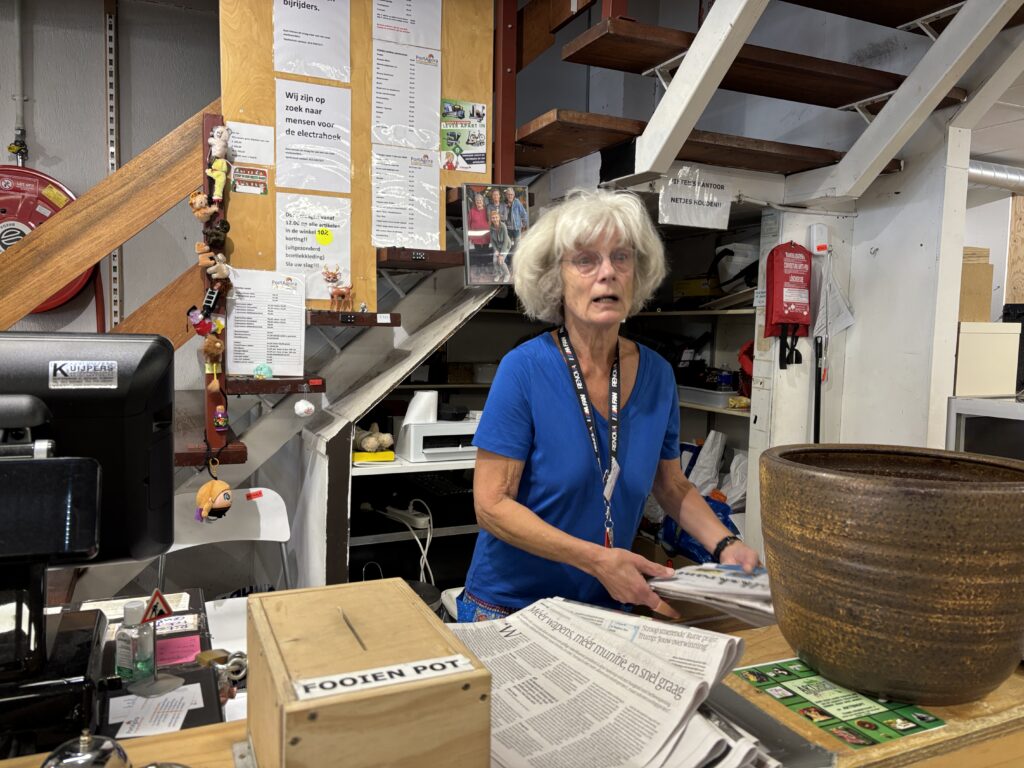 Dit is Lidwien (69). Ze staat op dinsdag- en vrijdagochtend aan de kassa. Lidwien werkt al vier jaar bij PortAgora. Een gezellige, altijd vrolijke vrouw die heerlijk kan kletsen. We hadden laatst een vrijwilligersborrel bij PortAgora met hapjes, drankjes en leuke muziek en wie was de enige die stond te dansen… juist Lidwien! Helaas zijn er geen foto’s van. “Ik vind het heerlijk om uit m’n bol te gaan op de dansvloer. Ik ga ook regelmatig op zaterdagavond, samen met mijn man, naar Kims Kroeg om te swingen.” Lidwien is Amsterdamse van geboorte maar kwam naar Tilburg… “omdat hier normale mensen wonen, zonder poeha. Ik heb een hekel aan mensen met poeha.” Een vrije geest, die Lidwien. Zo gaat ze graag zwemmen op de naturistencamping aan de Zwartvenseweg. “Ik ben dol op zon en water, altijd geweest. En heerlijk vrij, die knellende kleding heb ik afgezworen.”